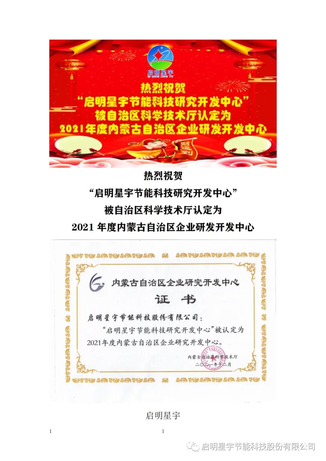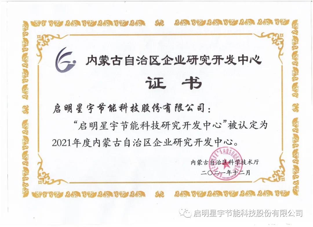 熱烈祝賀啟明星宇研發(fā)中心,升級為《2021內(nèi)蒙古自治區(qū)企業(yè)研發(fā)開發(fā)中心》